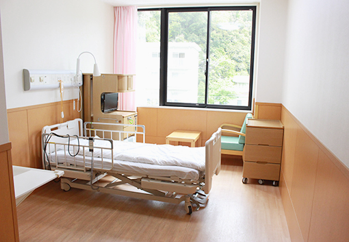 テレビ、床頭台(冷蔵庫・セーフティーボックス付)、応接セット、チェスト、洗面台、トイレ、有線インターネット利用可| 2病棟(地域包括ケア病棟) | 2室 |