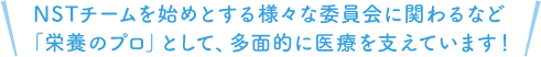 NSTとは、様々な職種の専門性を活かした栄養をサポートするチームです。管理栄養士が中心となり、チームをまとめます。
